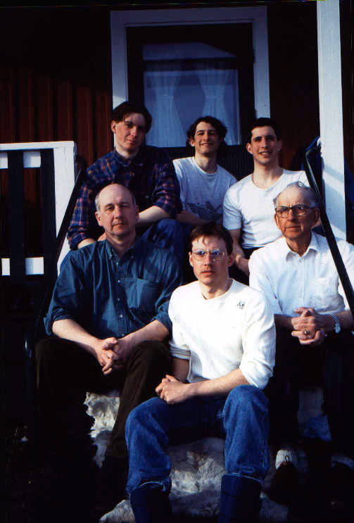 1996, on the porch of what is now Fredīs house. My father is to the right, left Fred and behind him his second son Andreas. Between Fred and Bengt is Fredrik, Fredīs nr one. My firstborn Philip, born 1975 is behind Bengt and to Philipīs left is my nr two, Victor born 1978.