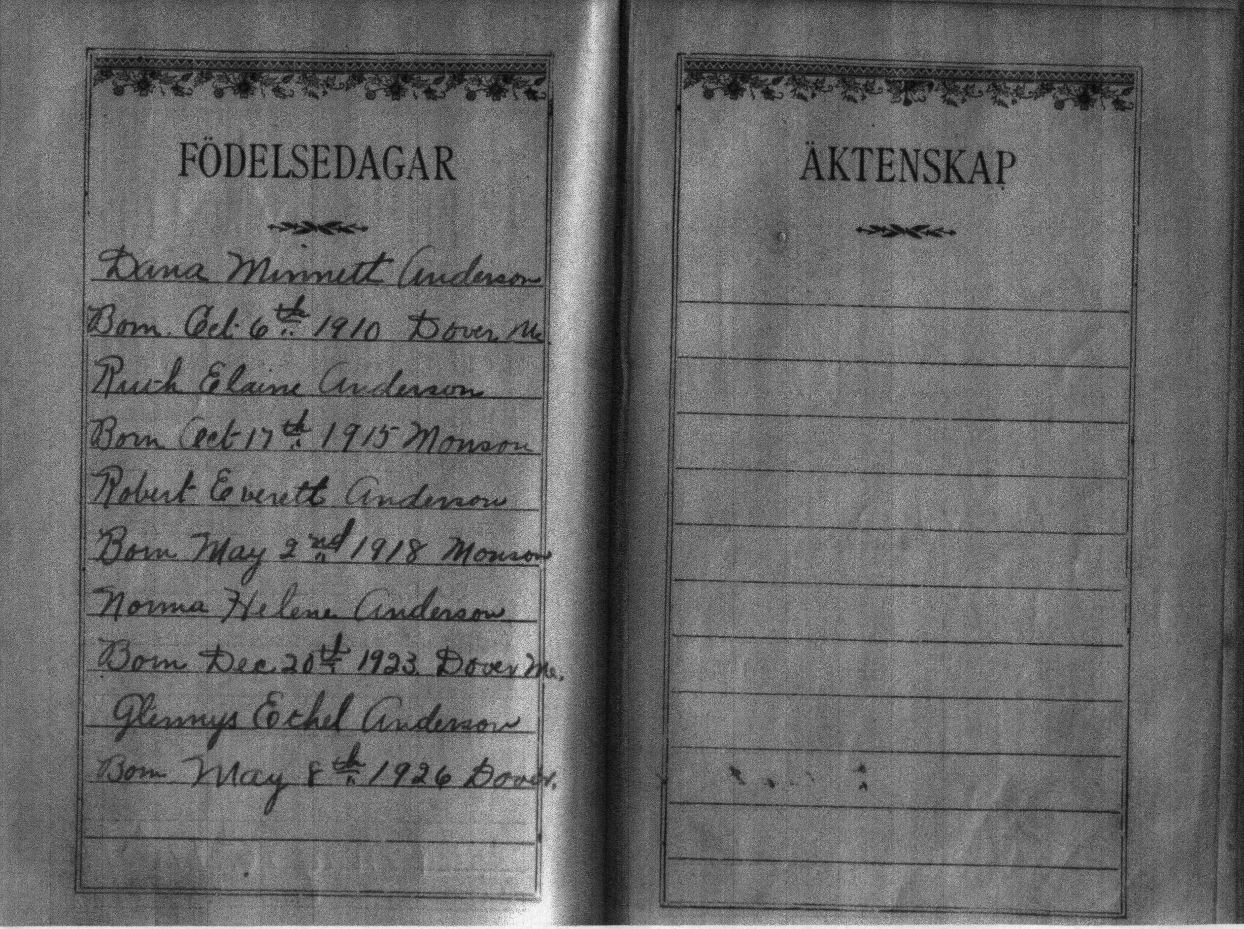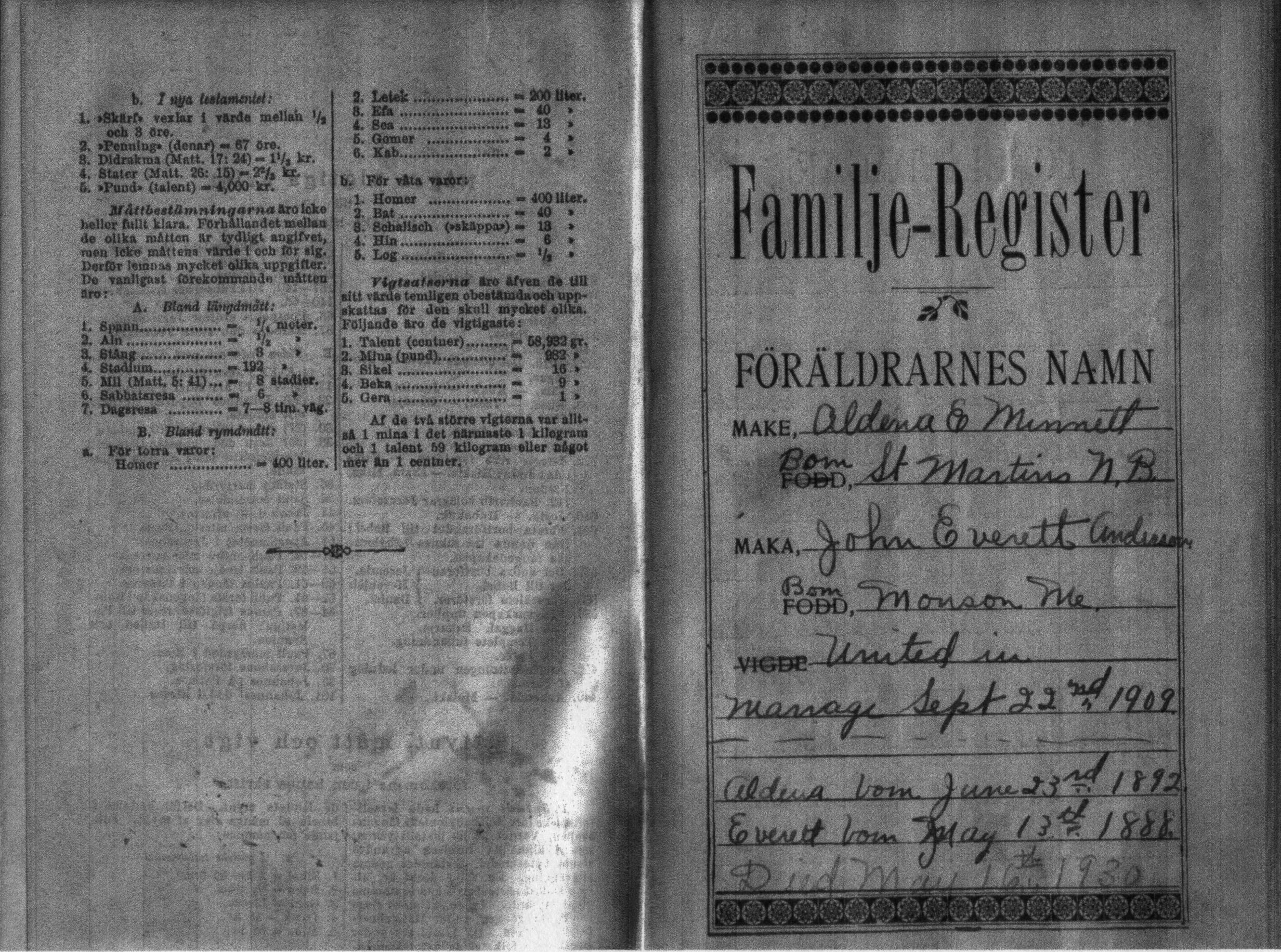 Glennys and Norma also had a family bible that belonged to their mother (Aldena E. Minnett). I have scans of three sections, the first has Aldena's and John Everetts marriage and births listed and a penciled in death date. The second