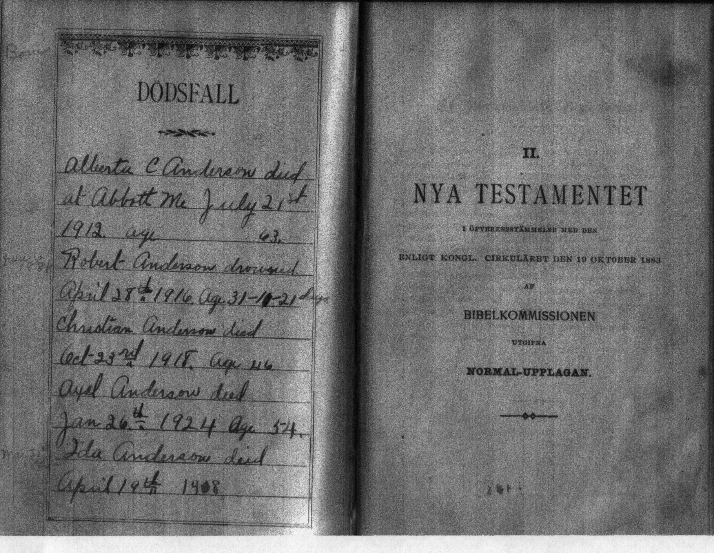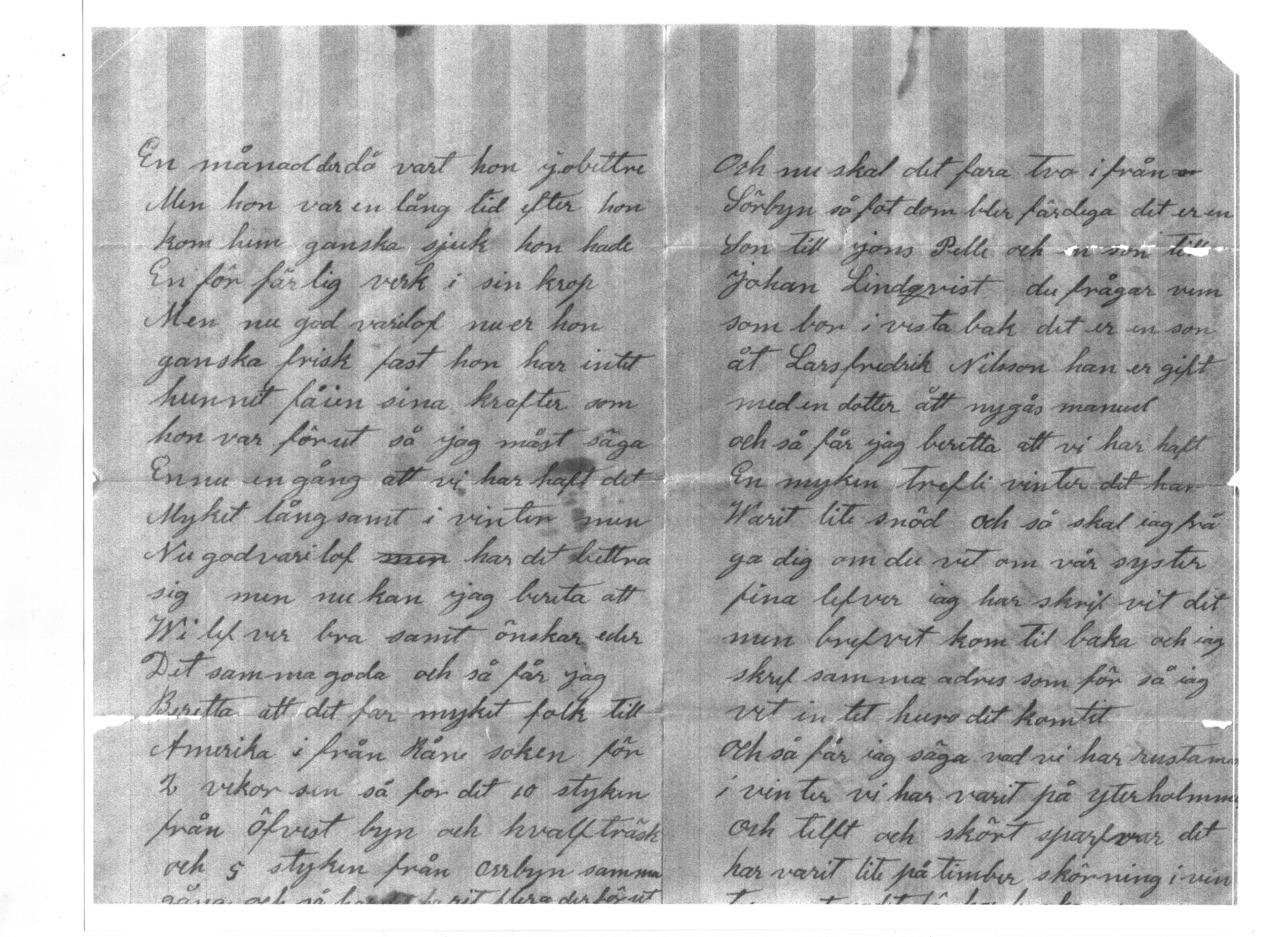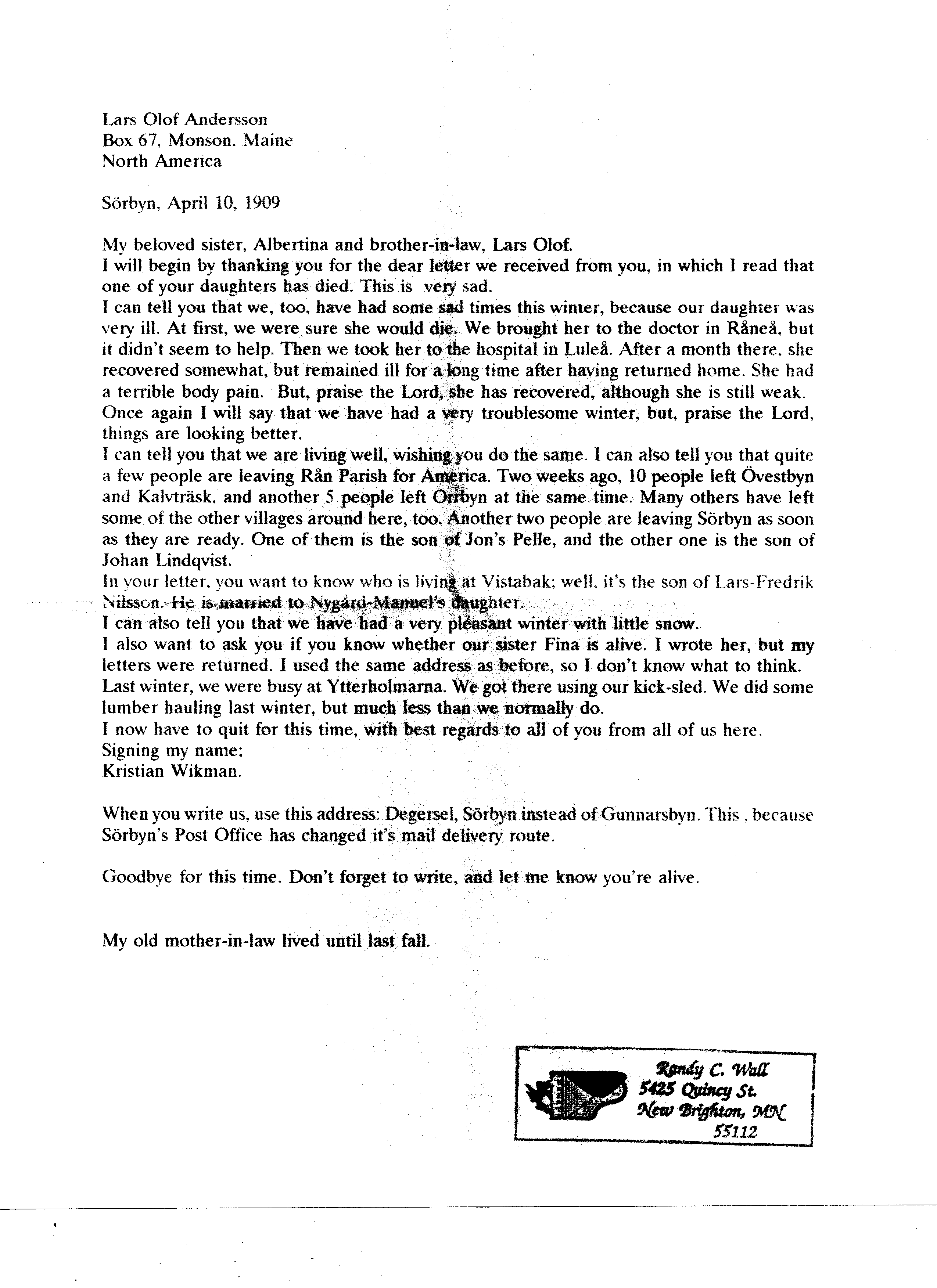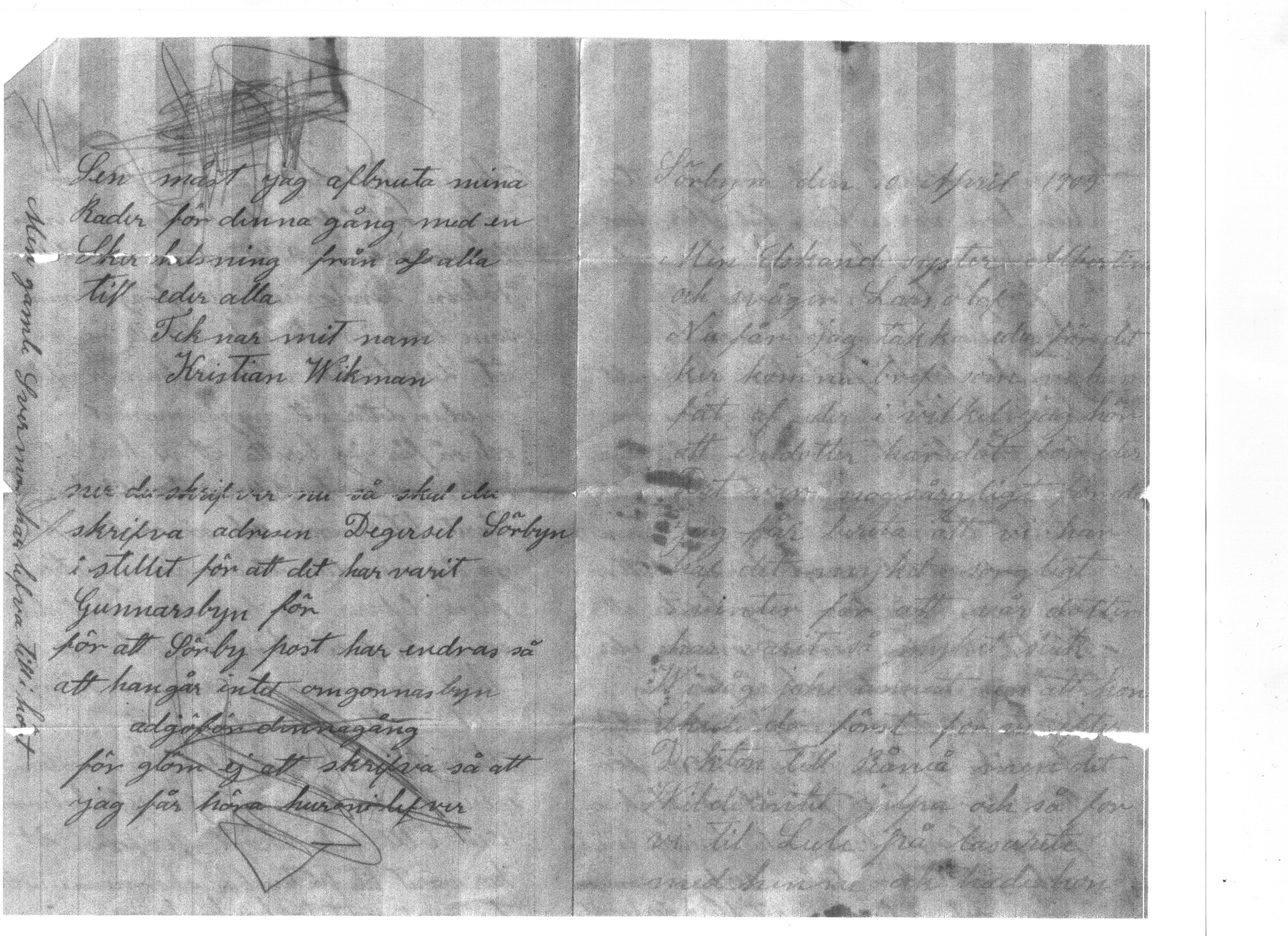 Added scans of a letter from Kristian Wikman to Lars Olof and Albertina Anderson on April 10th 1909. What I have is a copy of a copy and it has a bit chopped off. I'm hoping to get access to the original so I can get a better scan. The scribbles on page 4 were done by either Glennys or Norma (granddaughters of Lars Olof).